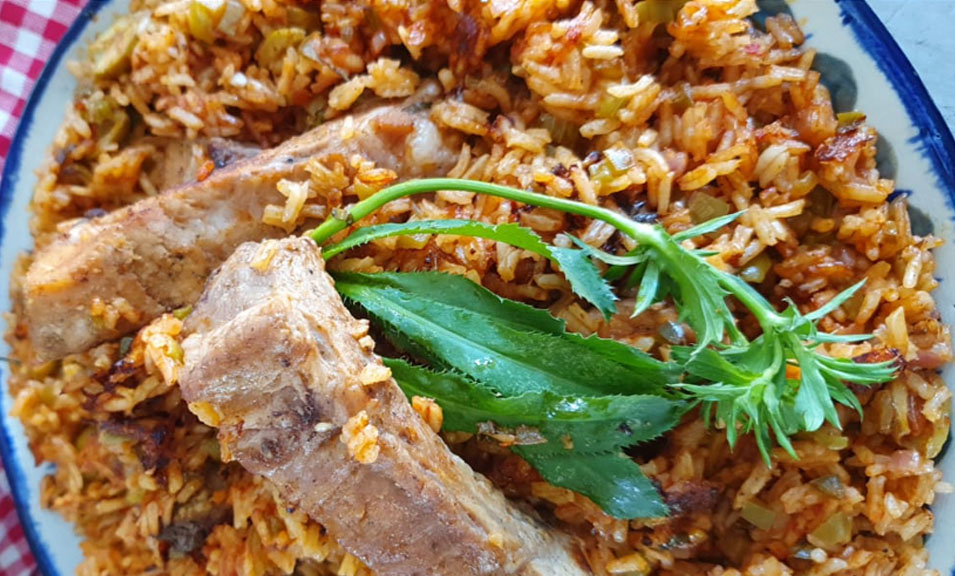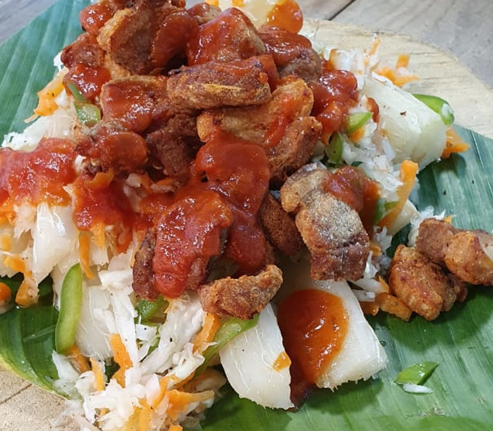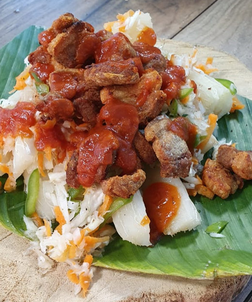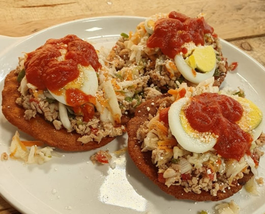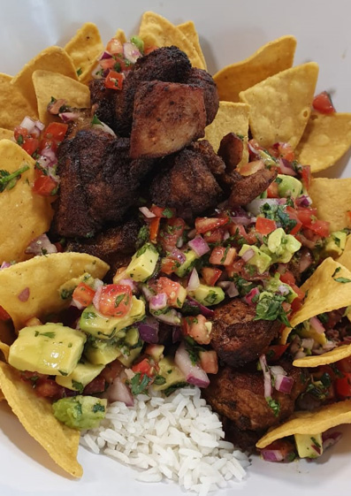 En un plato hondo ponemos un poco de arroz blanco, luego un poco de frijoles (no mucho caldo) unos chicharrones de los que freímos, otra tanda de frijoles y otra de chicharrones, ponemos el pico de gallo arriba y unas tortillas tipo nacho